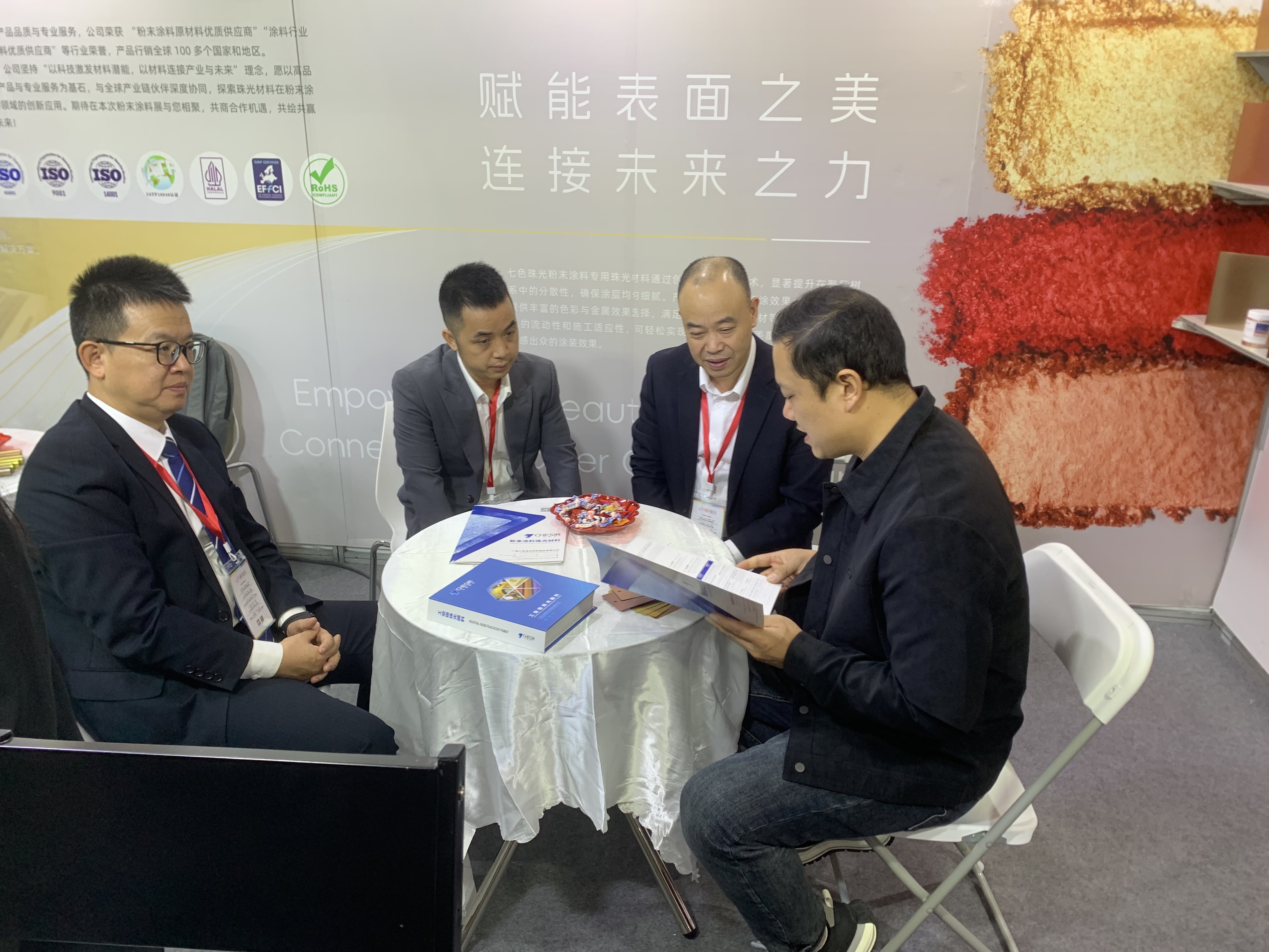 现场,众多粉末涂料与涂装行业企业到七色珠光展位参观、交流,公司团队认真倾听并记录了每一位客户的想法、需求与宝贵建议。