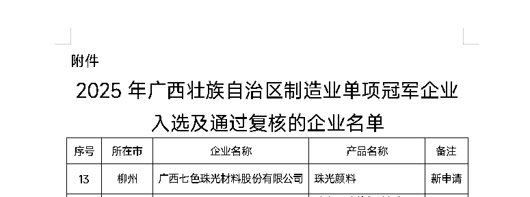 近日,广西壮族自治区工业和信息化厅正式公布“2025年广西制造业单项冠军企业名单”,环球新材国际旗下广西七色珠光材料股份有限公司成功入选!这一殊荣既是对七色珠光深耕细分领域、坚持高质量发展的高度认可,更是对公司创新实力、行业影响力与综合竞争力的权威背书。