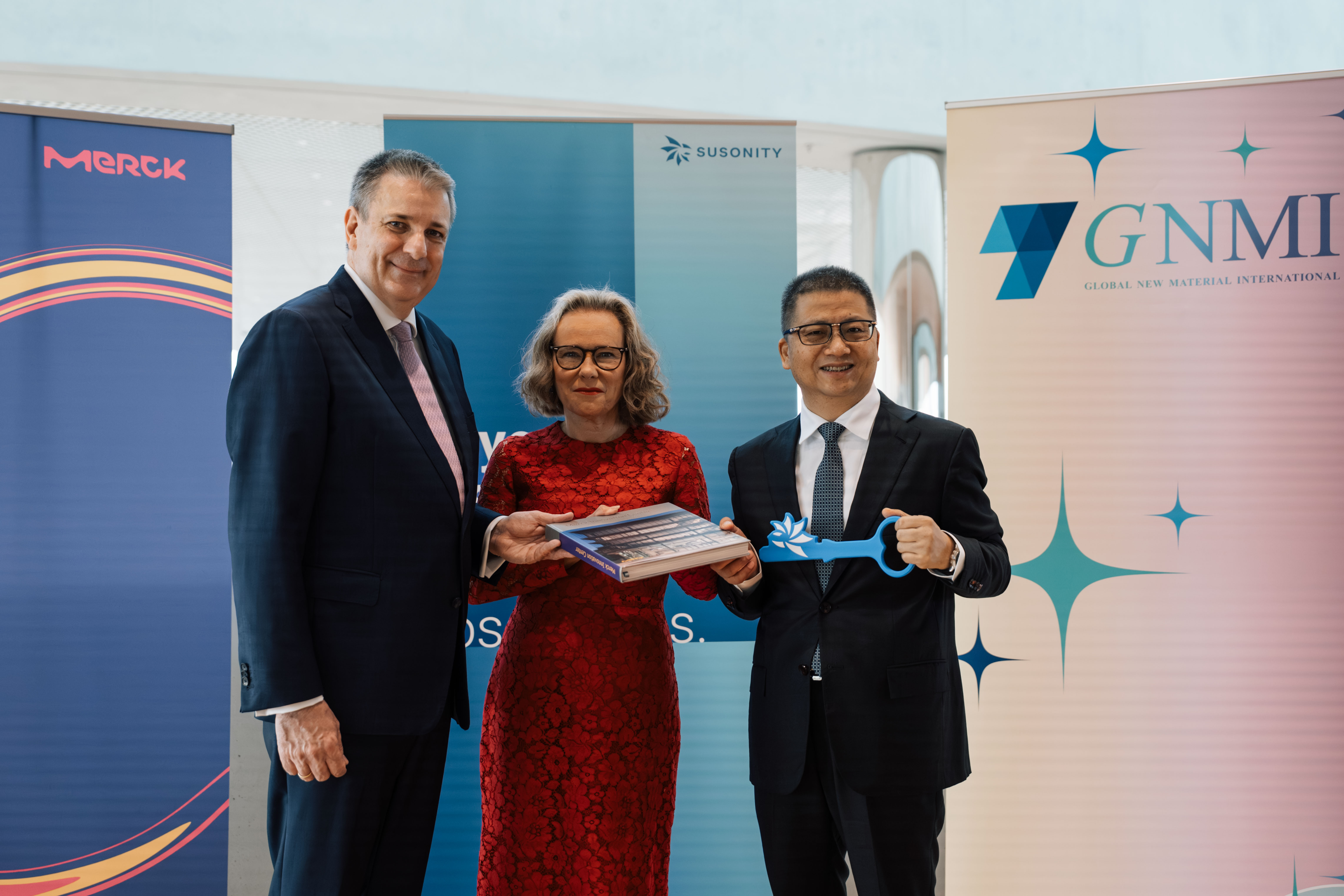 (Photo:) The closing ceremony of Global New Material International ‘s acquisition of German Merck SUSONITY was held on July 31, 2025. Su Ertian,Chairman and Chief Executive Officer of Global New Material International (right), Belen Garijo,Merck’s Chairman and Chief Executive Officer (middle), and Kai Beckmann,Merck’s Board Member and Chief Executive Officer of the electronics business (left),attended the ceremony.